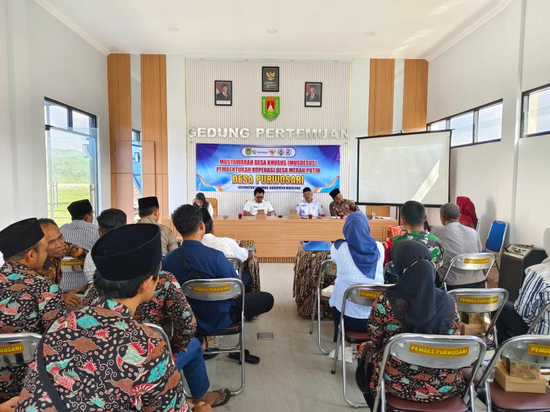 Purwosari (28/05/2025), Pemerintah Desa Purwosari melaksanakan kegiatan Musyawarah Desa Khusus Pembentukan Koperasi Desa Merah Putih (Musdesus Kopdes). Kegiatan ini dihadiri oleh BPD, Tokoh Masyarakat, Pendamping Desa, Babhin Kamtibmas, Babinsa. Isi dari kegiatan ini yaitu: